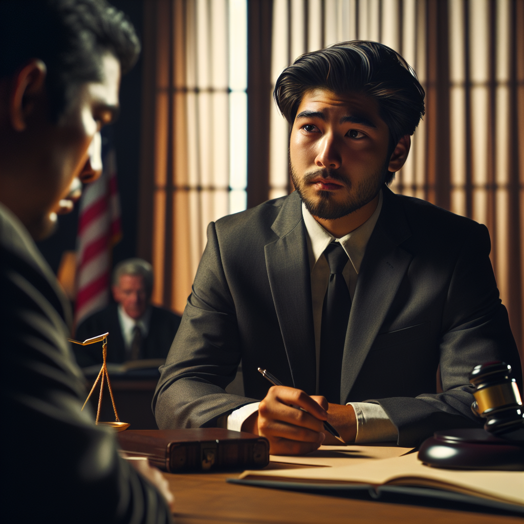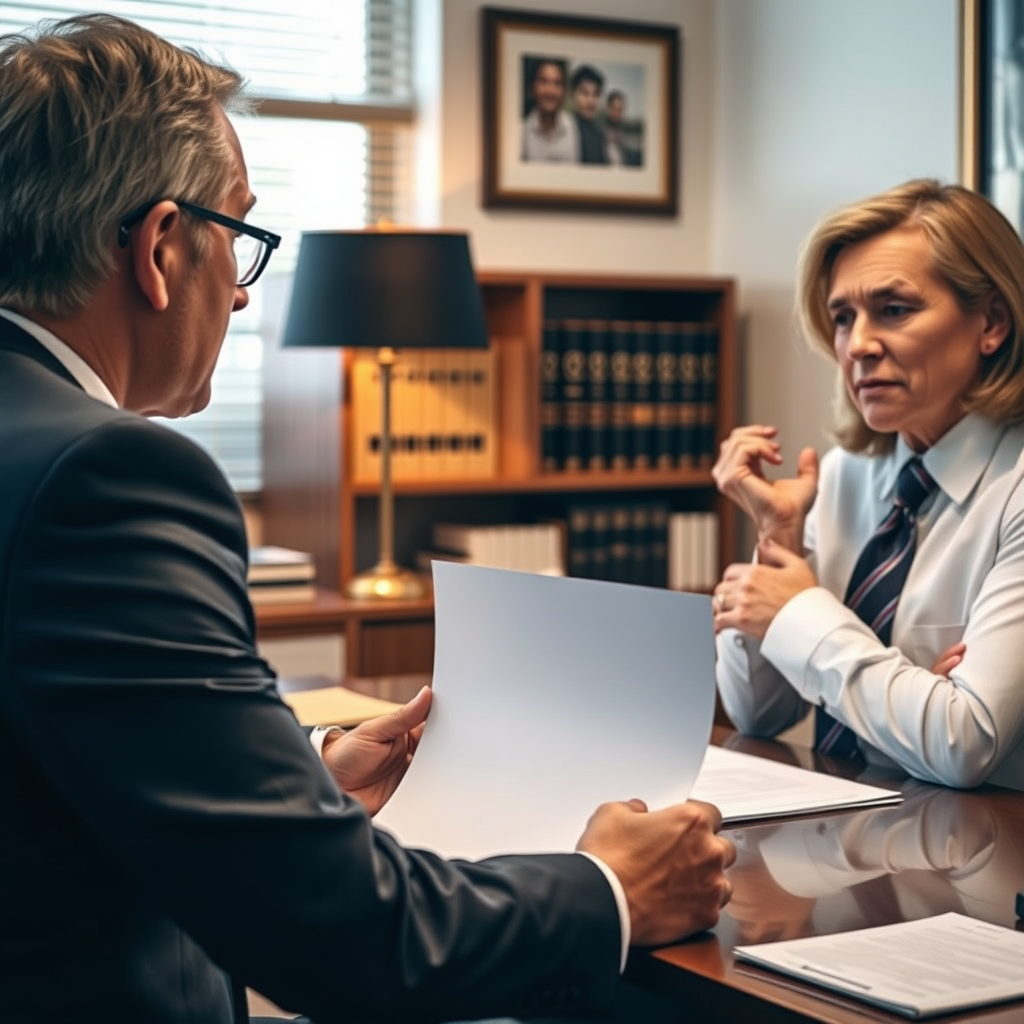 Alt Text 3: Abogado experimentado (Mr. Sris) en una mesa de conferencias, con expresión calmada y autoritaria, listo para ofrecer soluciones legales.